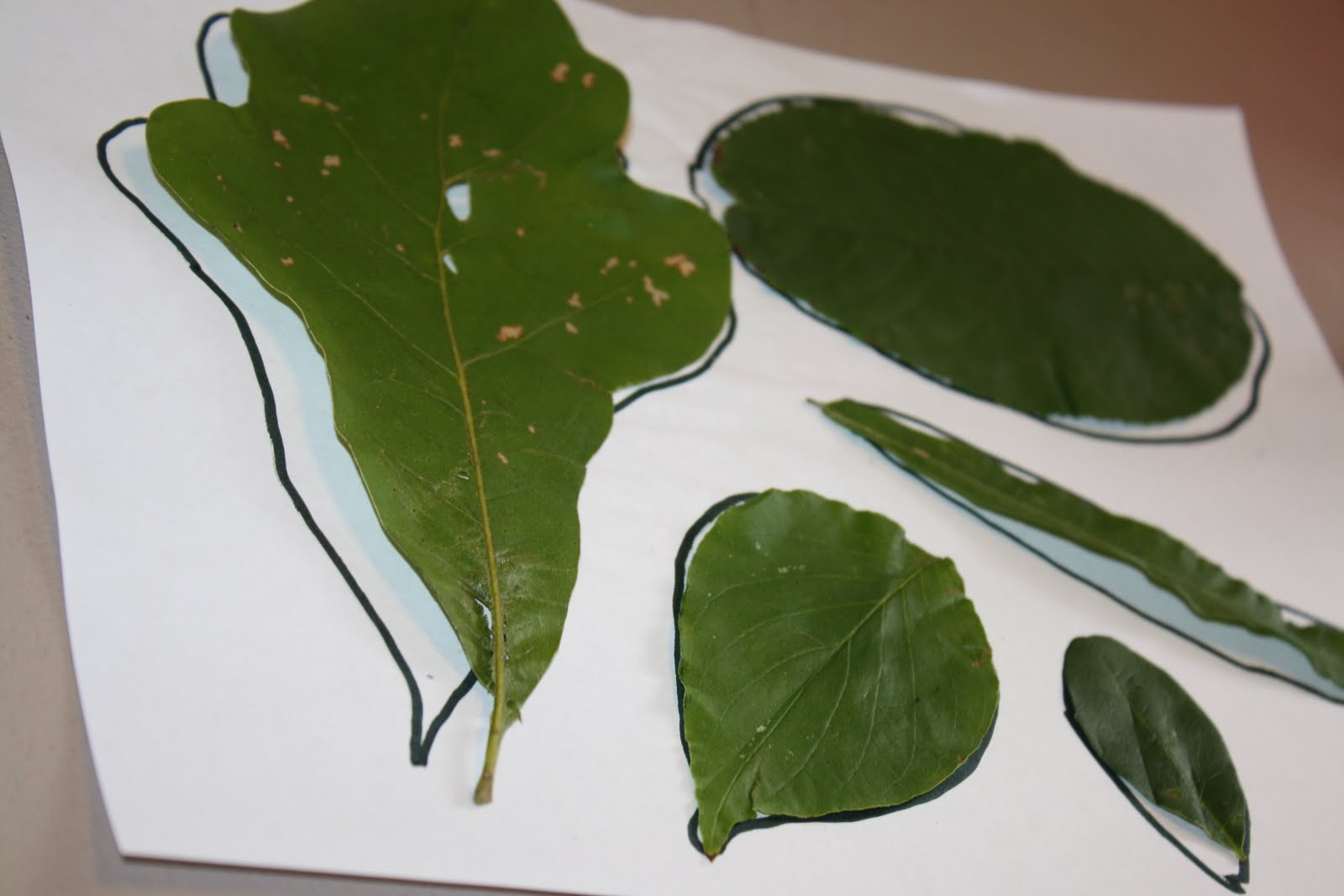 I also gathered all different shapes of leaves from my house. I made outlines of several of the leaves on a piece of paper and asked my students to find the matches. We also talked about "largest" and "smallest," leaves, etc.